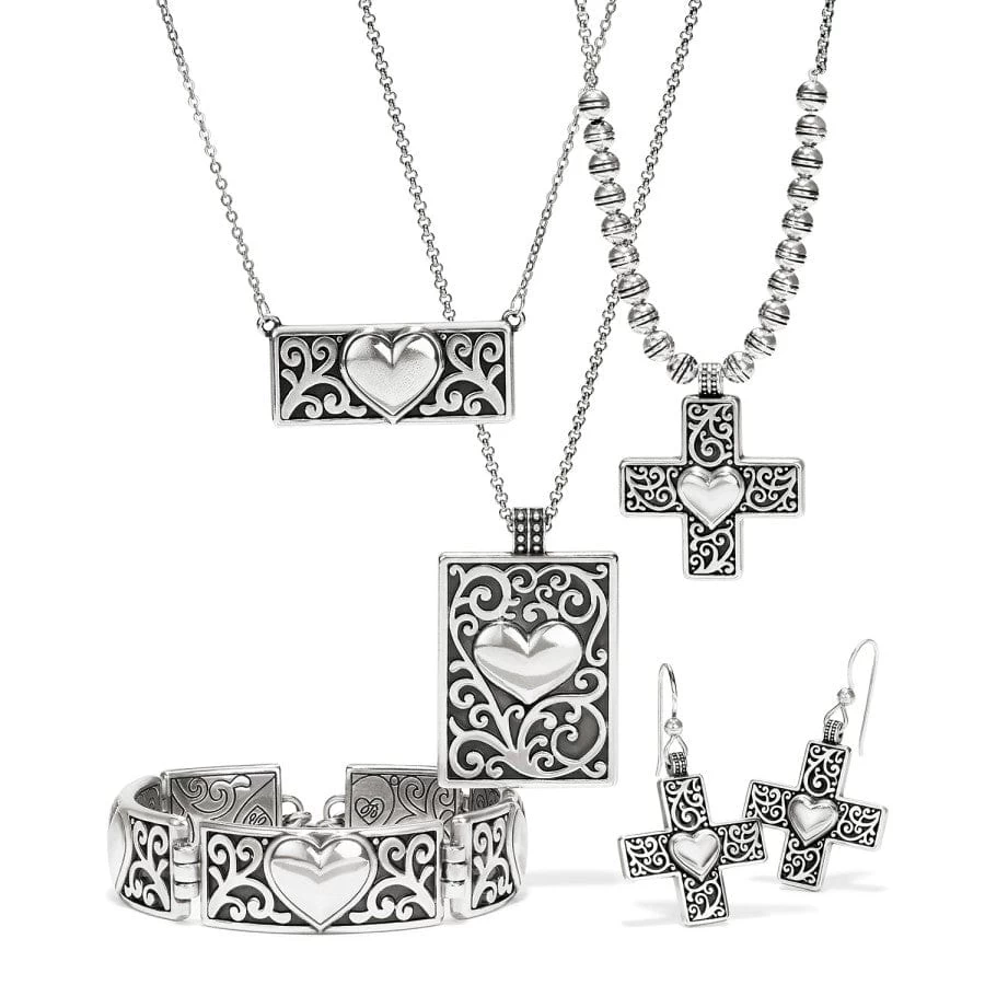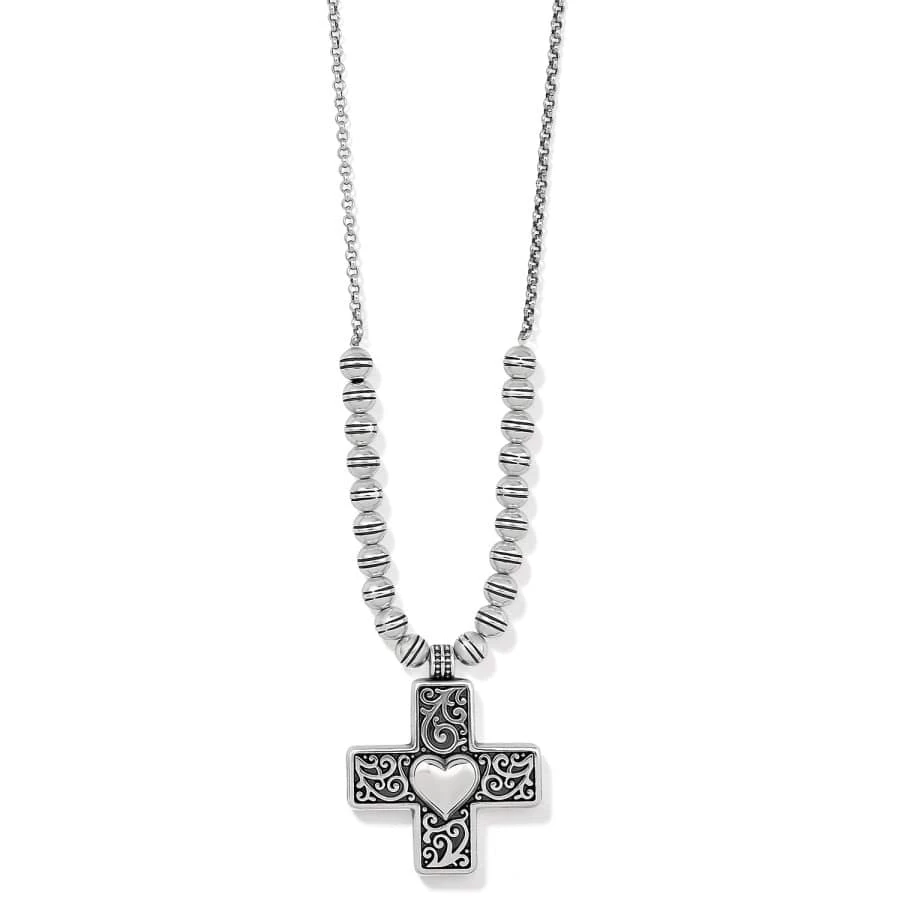 Iconic hearts and scrolls interplay beautifully in this high-contrast sculptural cross necklace.