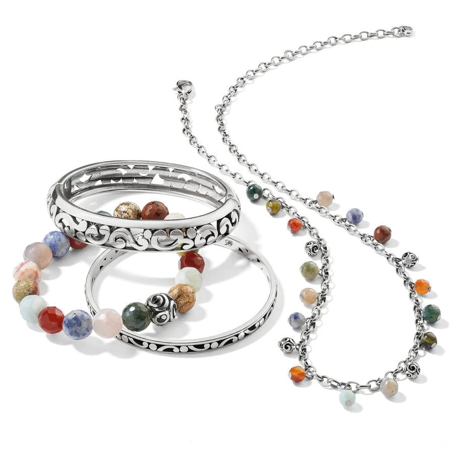 Natural semi-precious gemstones lend a painterly palette to this elegant bracelet, finished with a Contempo motif bead at the center! Because we have used natural materials, each stone is truly one of a kind and may have variations in color.