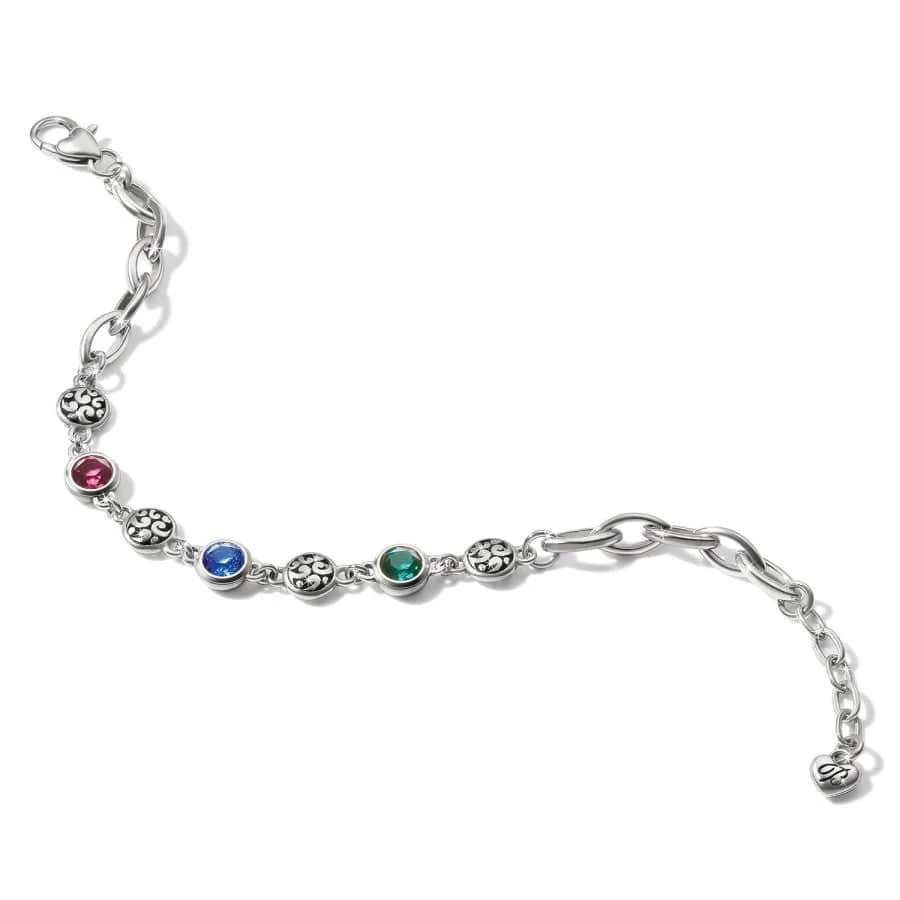 “Pointillism” is the technique of small, distinct dots of color, applied in patterns to form an image. This bracelet with translucent crystals in amethyst, aquamarine, emerald and sapphire, along with pierced silver scrolls, are dots that blend together to create a harmony of color and form.