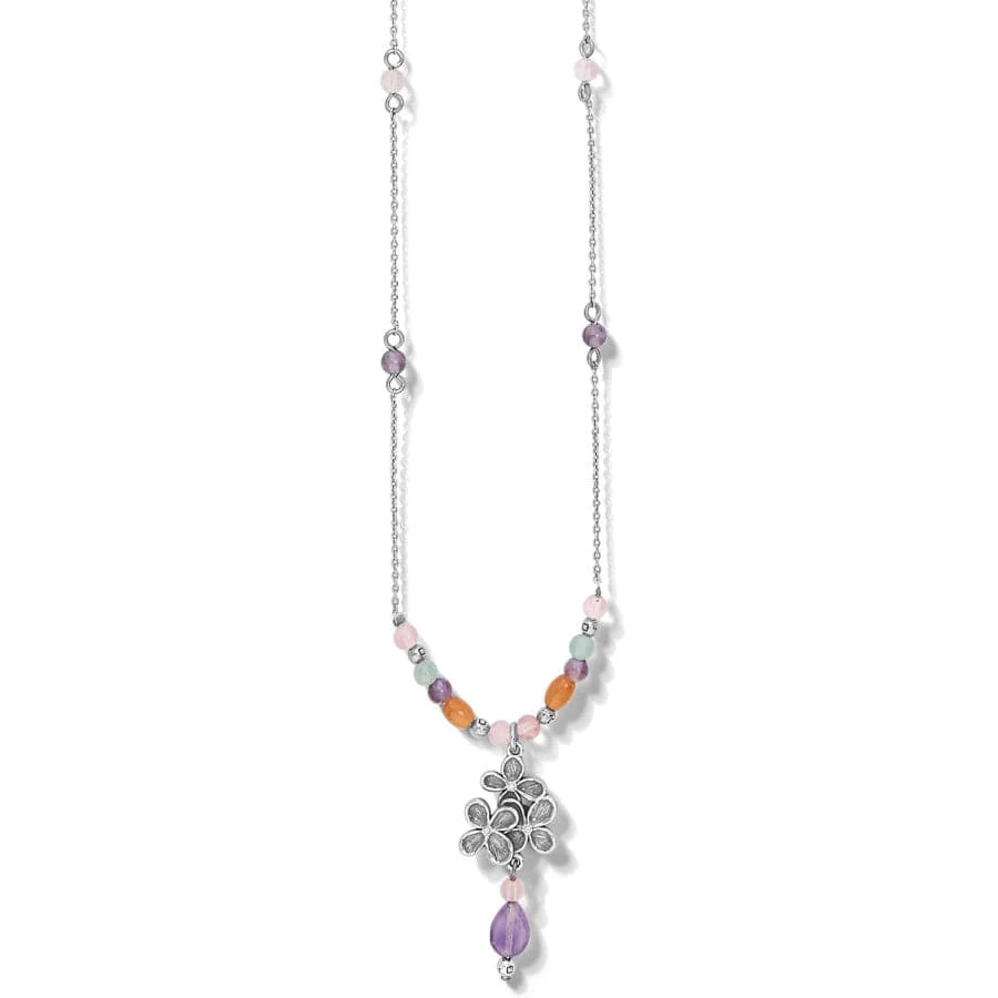 A delicate beaded necklace features a silver clustered flower pendant surrounded by semi-precious stones in various hues of quartz, aventurine and amethyst. Pair it with the shorter necklace of a lovely layered look.