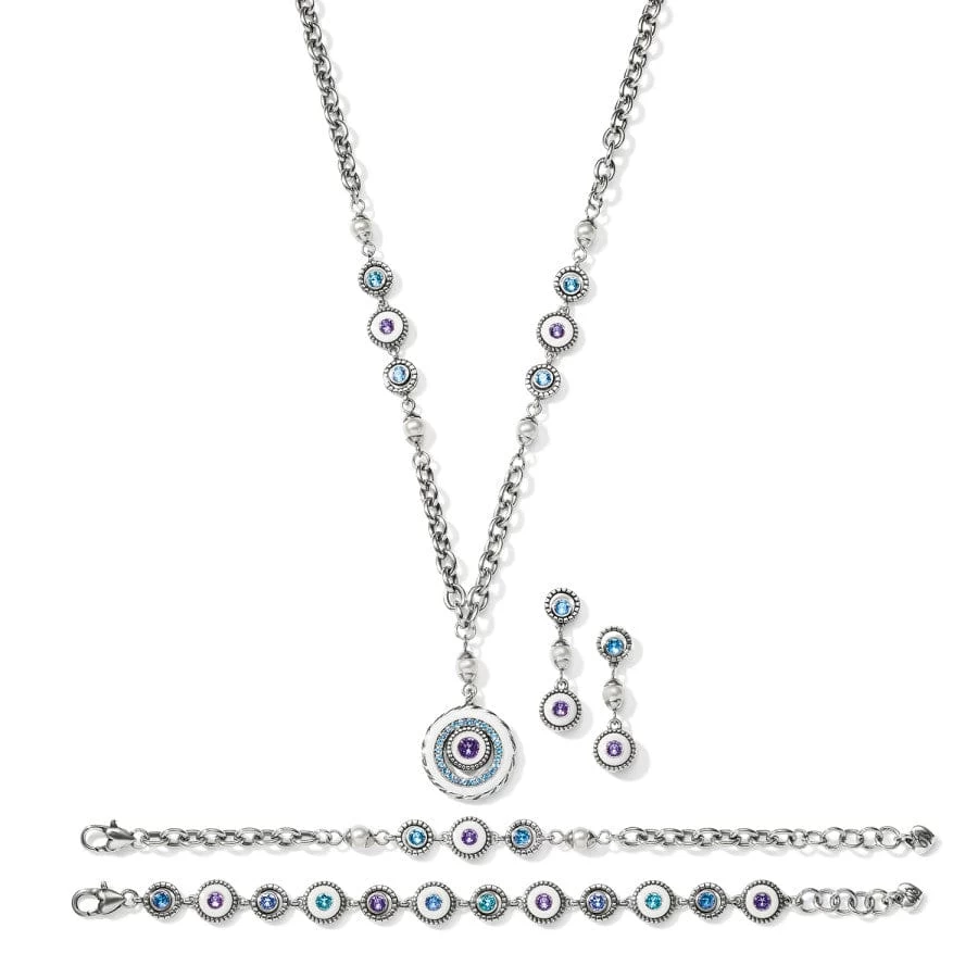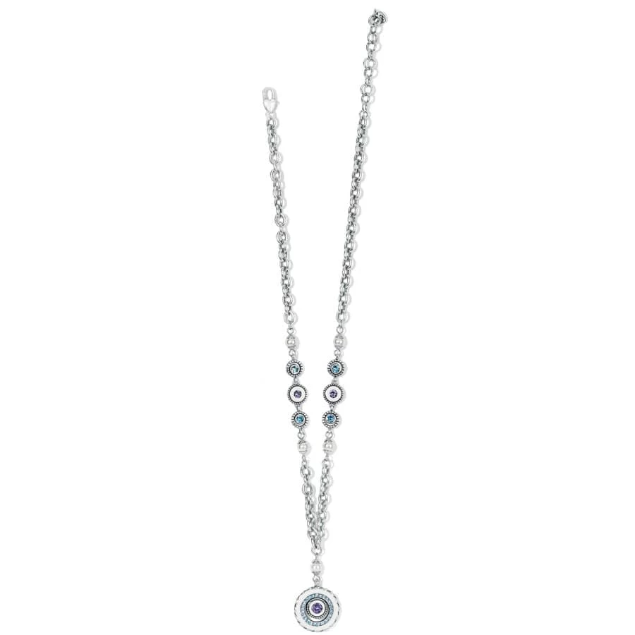 This round hand-enameled drop pendant necklace is adorned with a white pearl and crystal accents of tanzanite and aqua on a chunky chain – adding just the right touch of modernity to the timeless look.