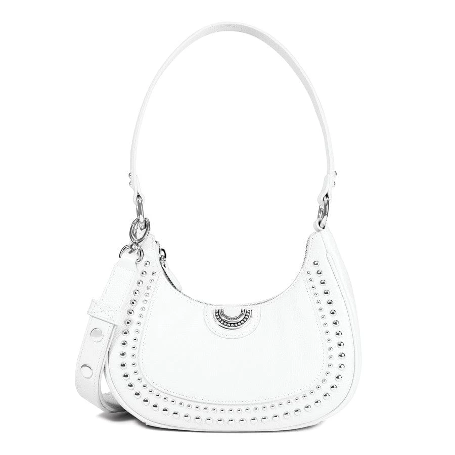 Meet the perfect silhouette for going from work to dinner and everywhere in between with a touch of effortless cool. The bag is decorated with the double row of studs. The convertible shoulder strap makes it easy to go from a shoulder length to a crossbody.