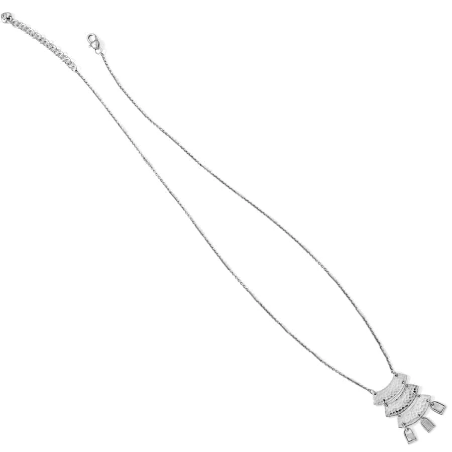 With a fresh twist on geometric motifs, this exotic collection includes sun-inspired shapes representing the setting sun of Morocco. This tiered necklace is an eclectic mix of polished, etched and hammered finishes.