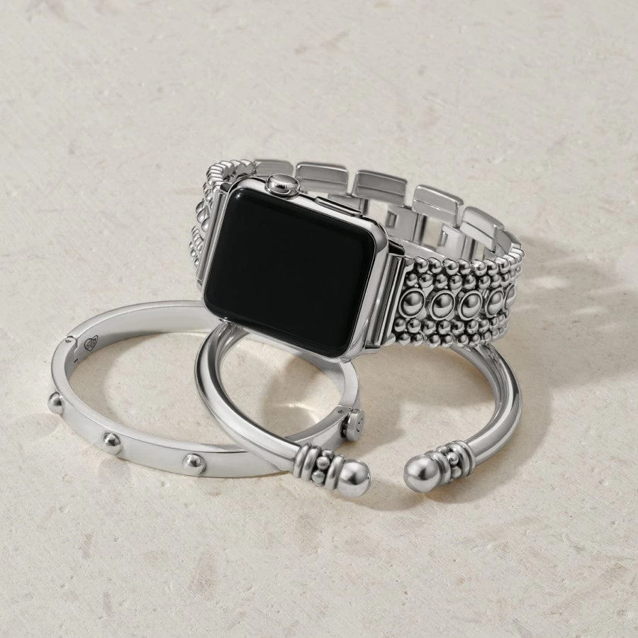 Designed to fit your Apple Watch®, this completely studded band features a center row of studs within the links appearing as a larger stud in a bezel – with smaller studs on either side. This band is close to a classic “link band” style – but with a unique take that still gives the feel of wearing jewelry. It offers three fold-over clasp extenders for adjustability, and fits 38 mm case size and larger.