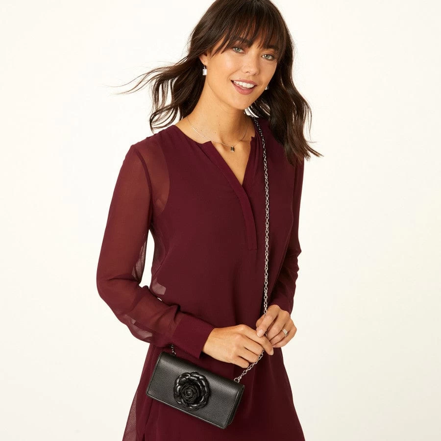 Adorned with a handcrafted rose, this wallet is so lovely, we included a chain strap so you can carry it alone as an evening bag if you’d like.